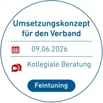 Bitte planen Sie während dieses Zeitraums die zeitlichen Kapazitäten ein, um das Erlernte für Ihren Verband entsprechend umzusetzen. Wir empfehlen die Teilnahme mit zwei Personen aus dem Verband.